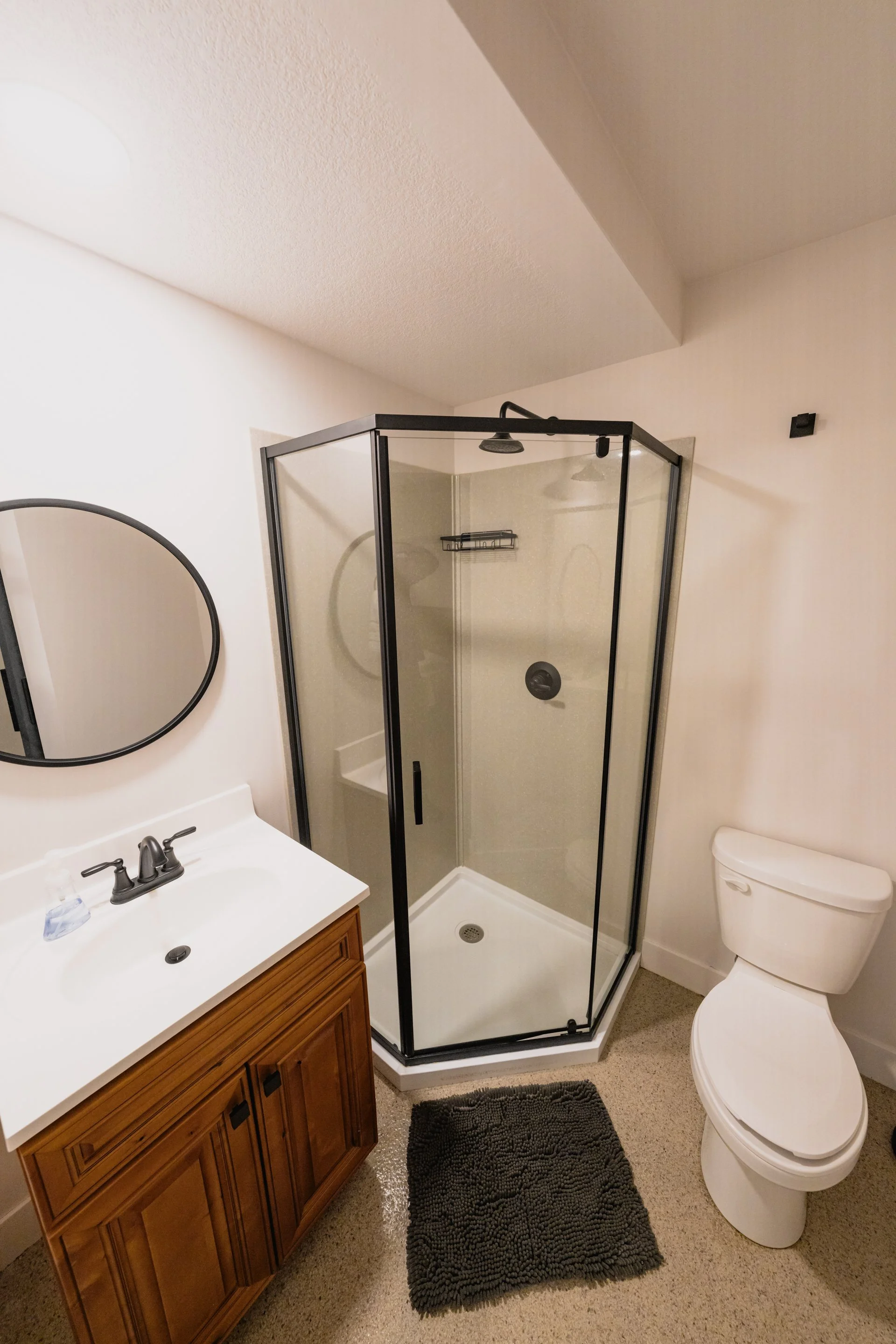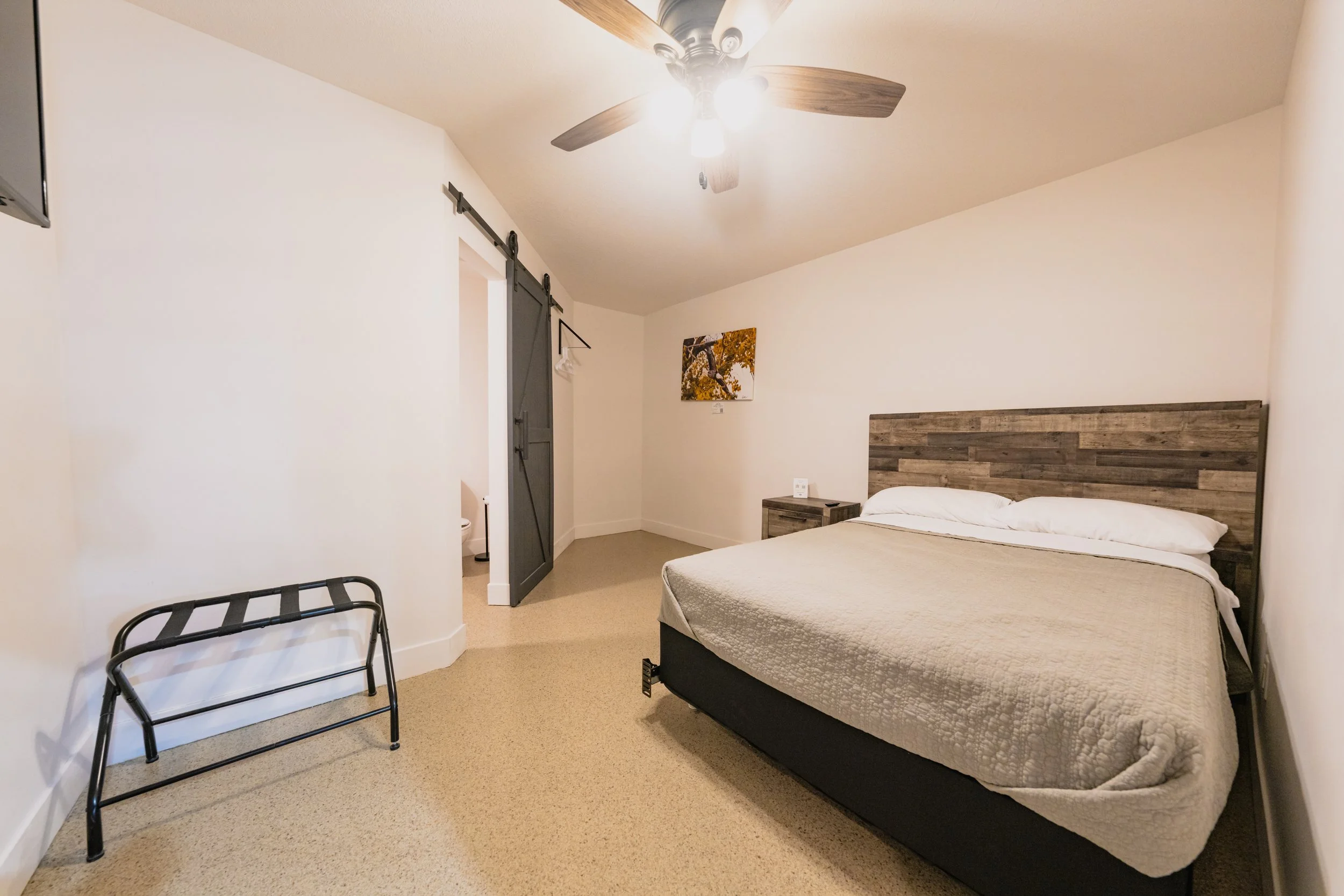 Room 2 is another full bed, private room on the ground level, providing your own living space, including a full bathroom. On the ground level, you are closest to the common spaces like the kitchen, dining room, living room, and recreation area.