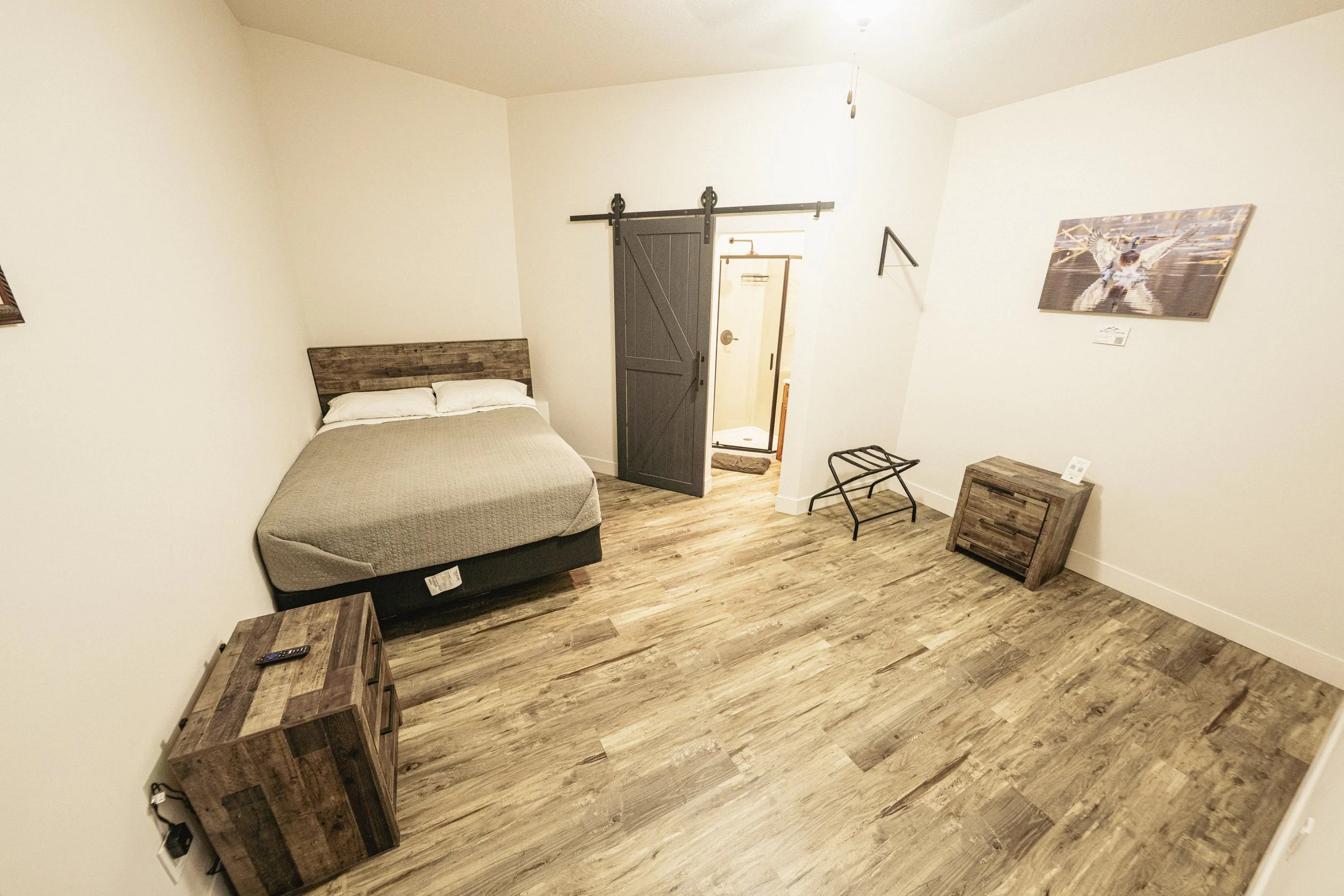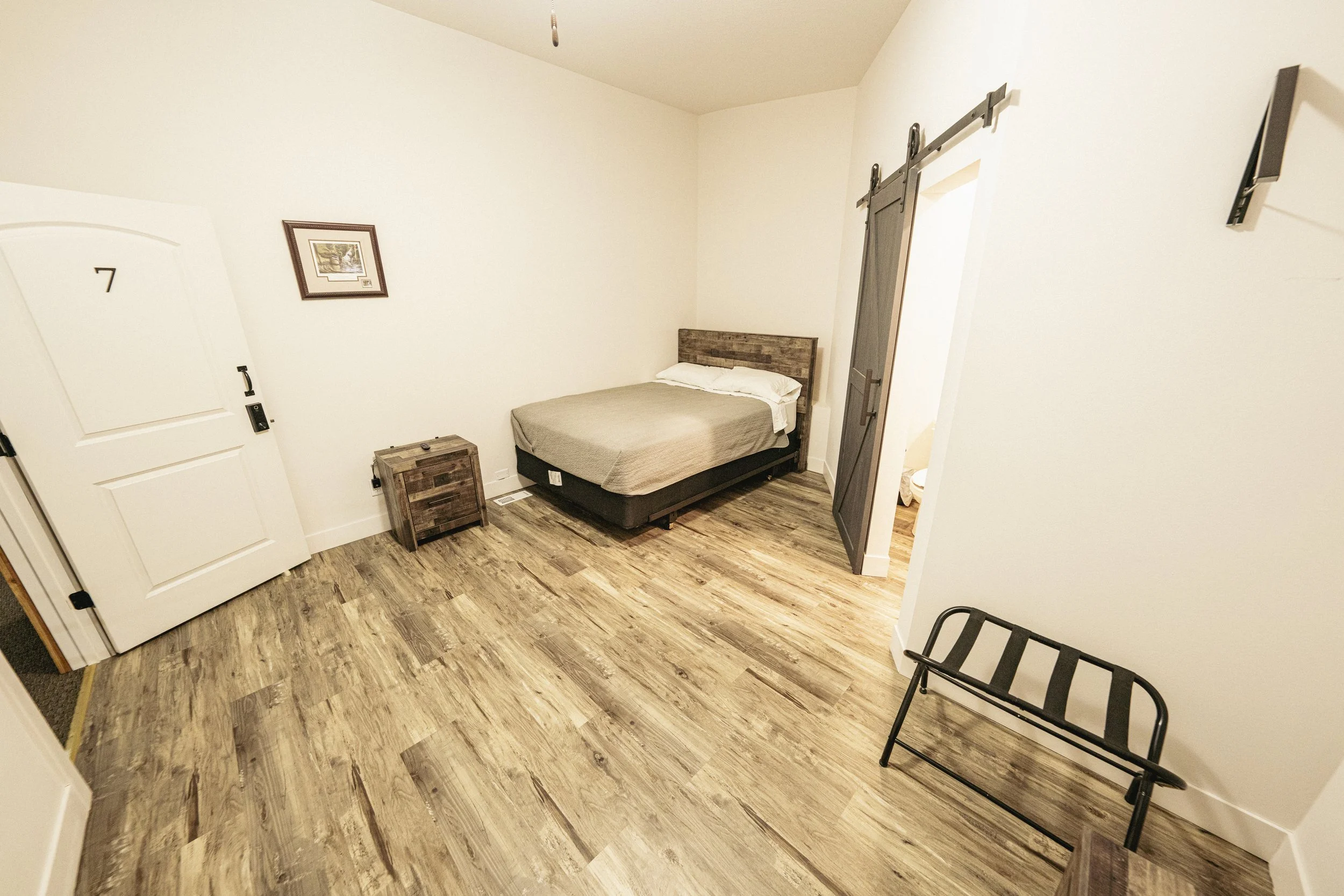 Room 7 offers a spacious Queen bed. This room is on the loft level, providing your own living space, including a full bathroom. On the loft level, you are furthest removed from noise and traffic in the common spaces.